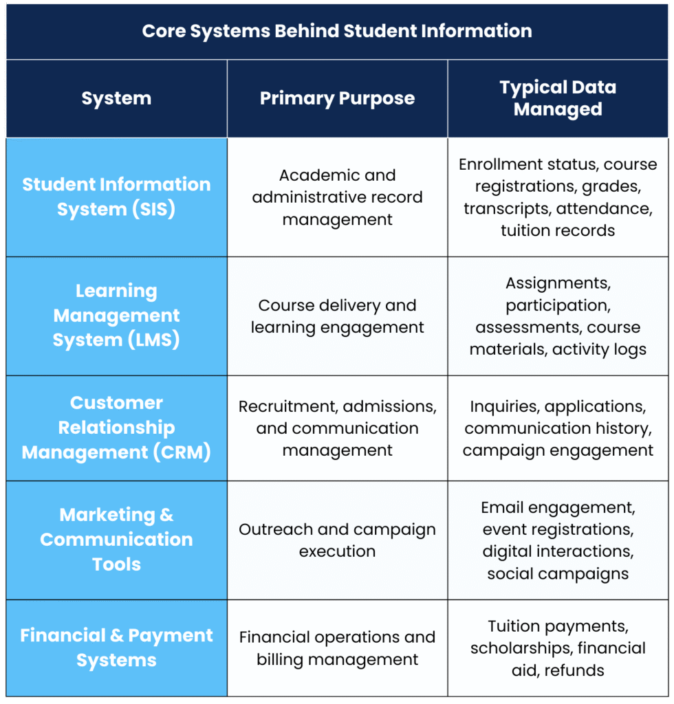 Student data is usually stored across Student Information Systems (SIS), Learning Management Systems (LMS), CRMs, financial systems, and marketing or communication tools.