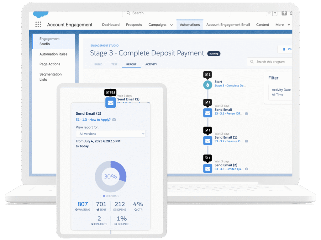 Build personalized email journeys in Salesforce Marketing Cloud Account Engagement (SFMCAE) to engage students, counselors, and partners at every stage of recruitment.