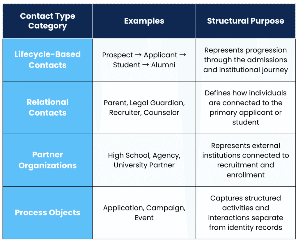 Higher education institutions do not manage a single type of contact. They manage an ecosystem of people and entities connected through different roles, stages, and processes. An admissions system typically handles far more than just applicants. It includes prospects, students, parents or guardians, recruiters, partner schools, agencies, and internal staff.